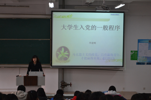 随后培训班正式开始。李建峰首先与同学们分享了发展党员的总要求:控制总量、优化结构、提高质量、发挥作用。李建峰指出学生干部一定要摆正入党动机,不断提高自身综合素质。随后,李建峰就入党的一般程序做了详细介绍。她表示一项工作教育和培养、二项申请、三次民意测验、三次公示、四类表格、五大阶段,李建峰结合图片,详细生动地为同学们介绍了入党流程等相关内容。接下来,李建峰为同学们解读了《曲阜师范大学党员发展细则》。她指出,入党要严格遵守相关规定,认真接受考试、审批等入党发展规定。李建峰表示大学生党员更应该不断学习,努力提高自身的思想道德修养。最后,李建峰用习近平在纪念五四运动95周年会上的讲话结束讲解。李建峰对我院学子提出殷切希望:希望同学们利用青春做该做的事,让青春无悔。