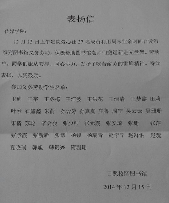 据悉,12月13日上午,我院爱心社37名成员利用周末课余时间自发组织到图书馆进行义务劳动,积极帮助图书馆老师搬运新进光盘架。劳动期间,37名学生积极主动地参与工作,服从老师安排,不怕苦不怕累,帮助老师搬运物品并进行规整,将雷锋精神发扬到底,充分彰显了传媒学子助人为乐的精神。对此,图书馆发来表扬信,信中称赞同学们在劳动中服从安排,同心协力,团结合作,发扬吃苦耐劳的雷锋精神。对参加本次义务劳动的爱心社成员卫迪、王宇、王冬梅等共计37人提出表扬,以资鼓励。