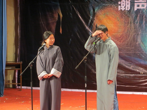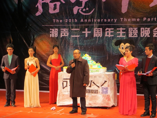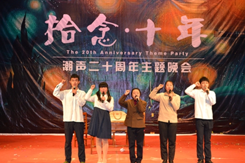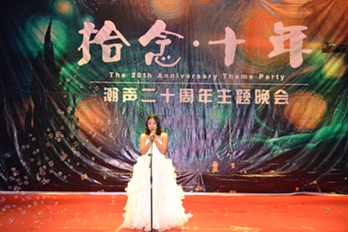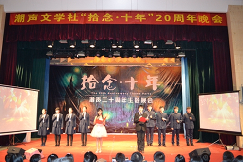 一声声振奋人心的鼓点之后,潮声文学社二十周年主题晚会正式拉开帷幕。衣着华丽的主持人深情对白“浓浓潮声情,痴痴潮声心。我为潮声人,我为潮声事”,至此潮声文学社“拾念·十年”主题晚会节目正式开始。