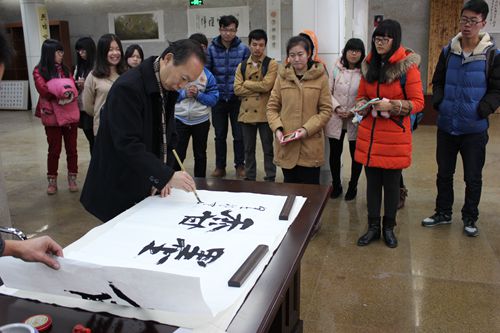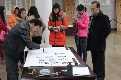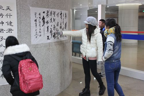 党总支副书记肖龙航,团总支书记刘蓉,墨缘书法协会创始人、2011级政治辅导员李兴出席画展启动仪式,开展前,高秀平、李兴分别为画展题字,并向前来参观的同学赠送题字。