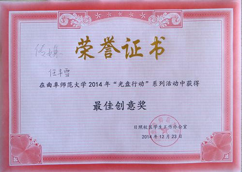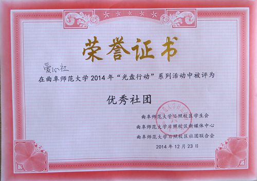 近期积极参加了曲阜师范大学2014年“光盘行动”系列活动,并在活动中取得了优异成绩。