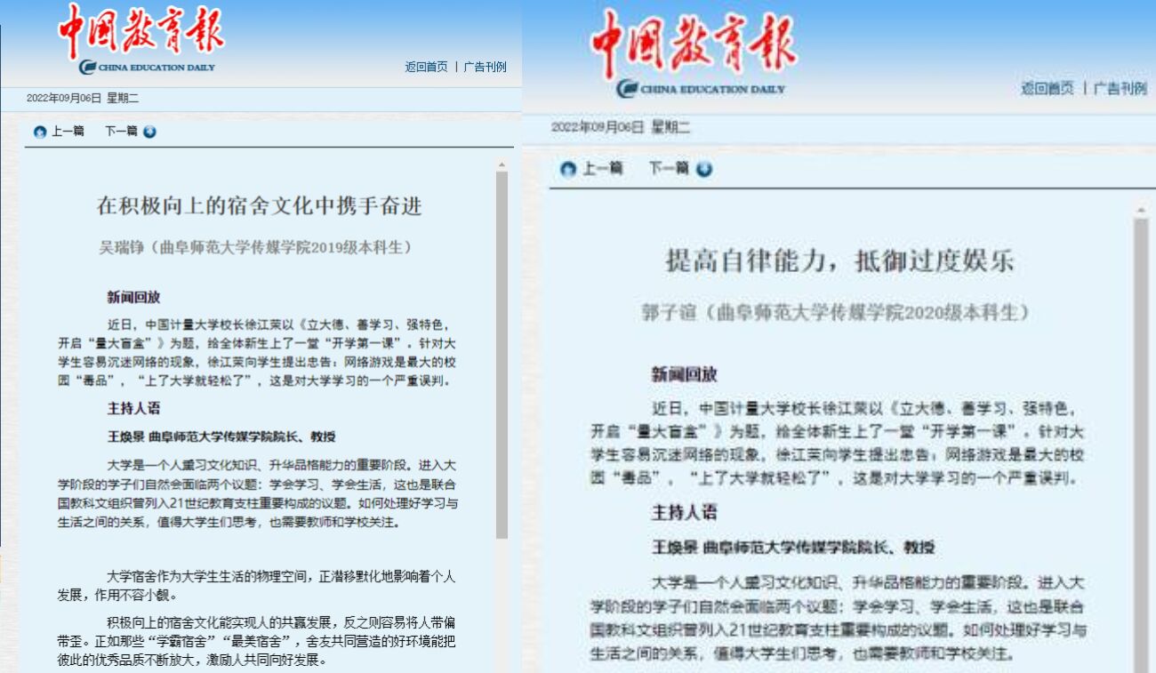 本科生2019级吴瑞铮、郭雨晴、2020级郭子渲在《中国教育报》发文,以中国计量大学校长徐江容在“开学第一课”上提出关于“上了大学就轻松了”的忠告为背景,畅言如何在大学生活中积极熏习文化知识、升华品格能力。