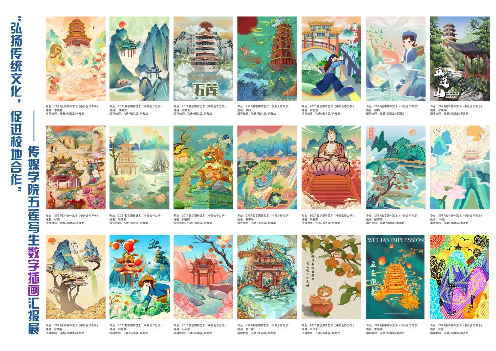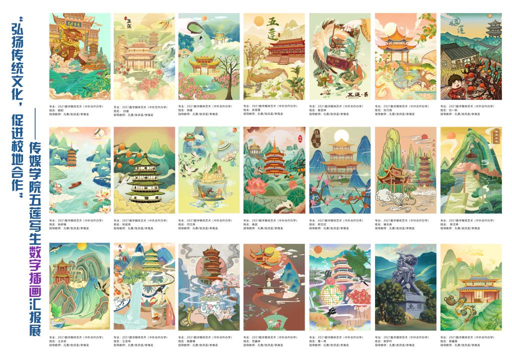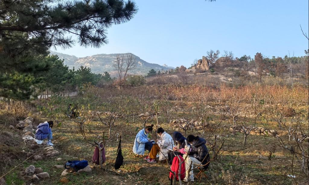 写生是数字媒体艺术专业学生的第二课堂,同时能够锻炼学生的专业水平和实践能力。在五莲山内,同学们席地而坐,手拿画笔,围绕《静止的物》、《不一样的树》、《孤独的房子》、《空间》等主题,沉醉在瑰丽巍峨的自然生态画卷中,用最真切的感悟为作品注入灵魂。绘画过程中,老师们对同学们的作品进行及时的指导教学。孔勇老师在写生绘画过程中讲到了速写与色彩画的特性,画面的选择与处理,为许多同学指明了在学生时代里需要寻找的绘画目的与方向。写生结束后,老师和同学们积极总结积累感悟,素材收集整理,通过数字绘画方式结合传统文化、五莲地方特色等元素进行了五莲山为主题的数字插画绘制。