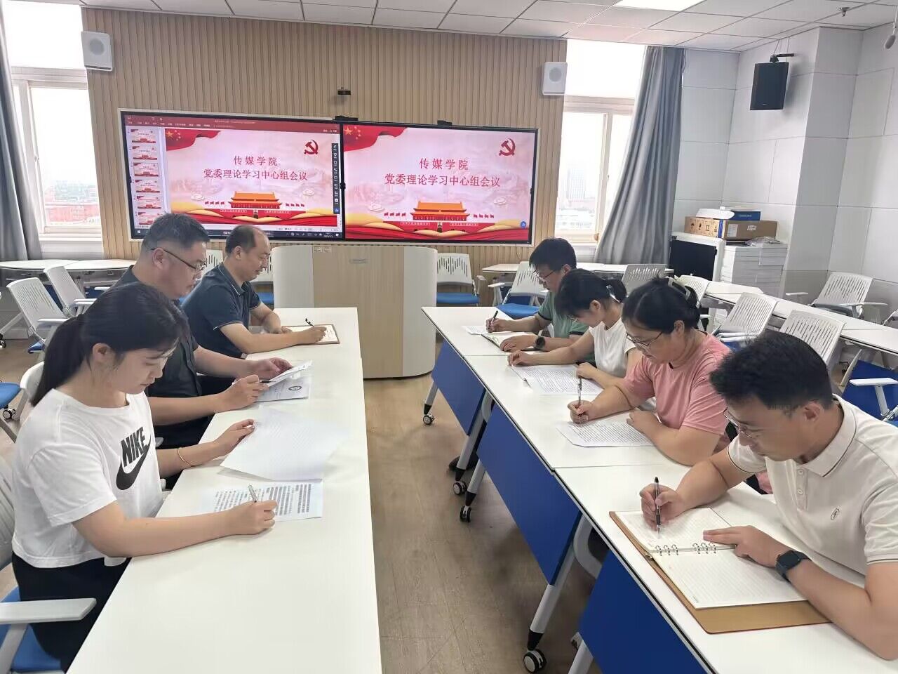 理论学习中心组全体成员参与学习并进行讨论。