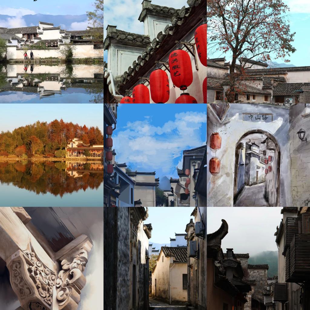 师生一行先后到达黟县宏村、卢村、屏山、赛金花以及塔川森林公园等地,深入领略了徽州地区的传统风格建筑和古村落的历史遗迹。在老师的指导下,学生们以敏锐的镜头感和细致的观察力,用光影捕捉景色的古老与宁静,用画笔展现出传统文化的深厚底蕴,在实践中感受徽州魅力,也在交流碰撞中拓宽艺术想象。