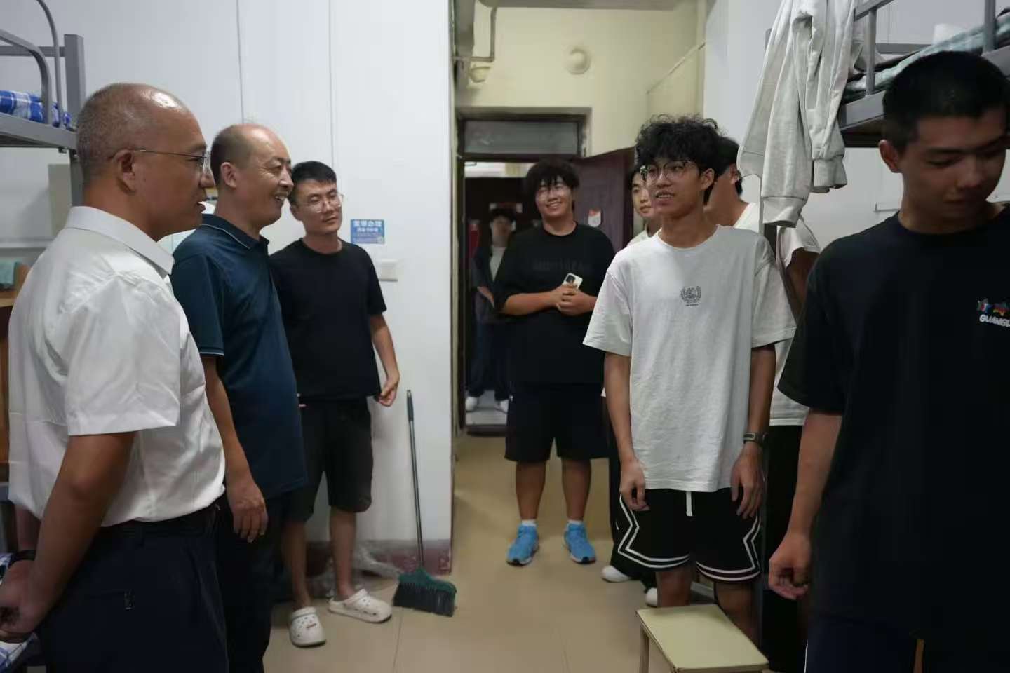 党委书记田维柱、院长王焕景、党委副书记田荣林、副院长赵可云、副院长刘波、党委委员、院长助理徐振国和辅导员张洪孟走进新生宿舍开展慰问走访活动。