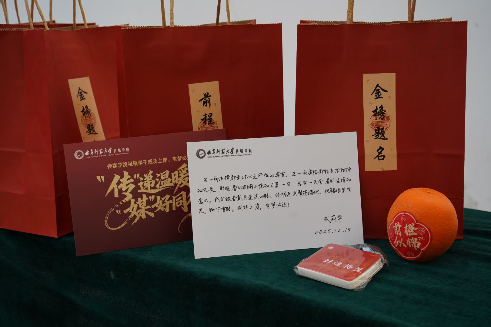 活动现场氛围温馨。印有“金榜题名”“前程似锦”字样的红色礼包格外醒目,其中不仅装有学院与考德上研机构精心准备的零食水果,还附有老师们亲笔写下的祝福卡片,承载着对学子们的殷切期望。到场同学均可领取一份专属礼包,感受来自学院的关怀与鼓励。