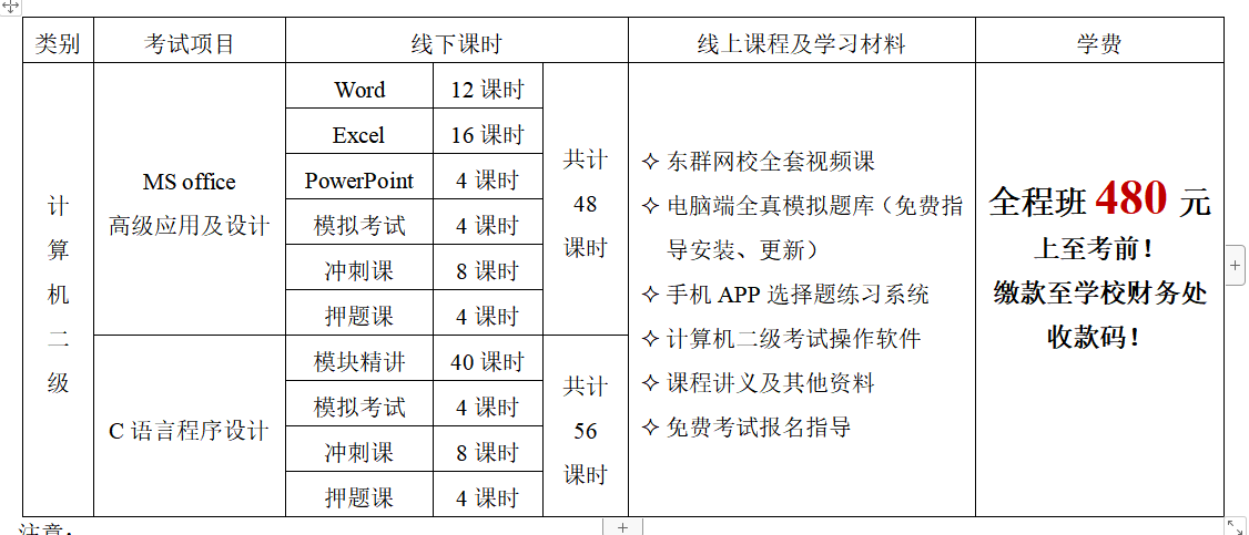 五、曲阜师范大学校内东群教育计算机二级培训内容及收费标准公示如下: