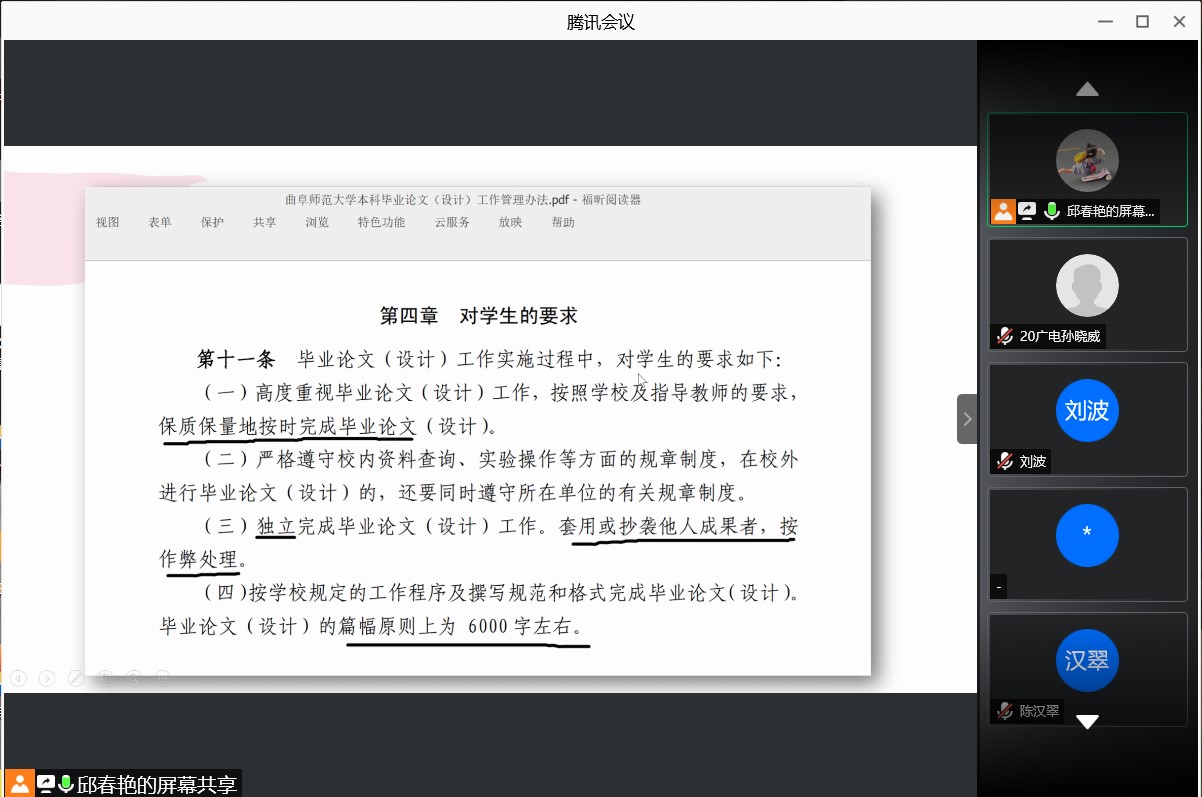 会议上,邱春艳老师就《曲阜师范大学本科毕业论文工作管理办法》详细介绍了本科毕业论文的写作规范、逻辑构建及论文写作中的注意事项,并结合具体实例,提出了撰写建议。她强调,毕业论文应做到结构严谨、表达简明、语义确切、使用学术用语、避免口语化表达。邱春艳老师还向与会同学分享了参考文献的检索技巧与经验,同时强调论文写作过程中必须遵守学术道德规范。会议最后,邱春艳老师表示,希望同学们能够认真对待毕业论文,并预祝同学们能够顺利完成学业任务。