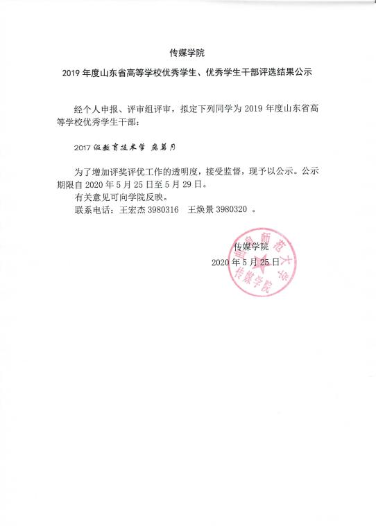 足球在线直播 2019年度山东省高等学校优秀学生、优秀学生干部评选结果公示